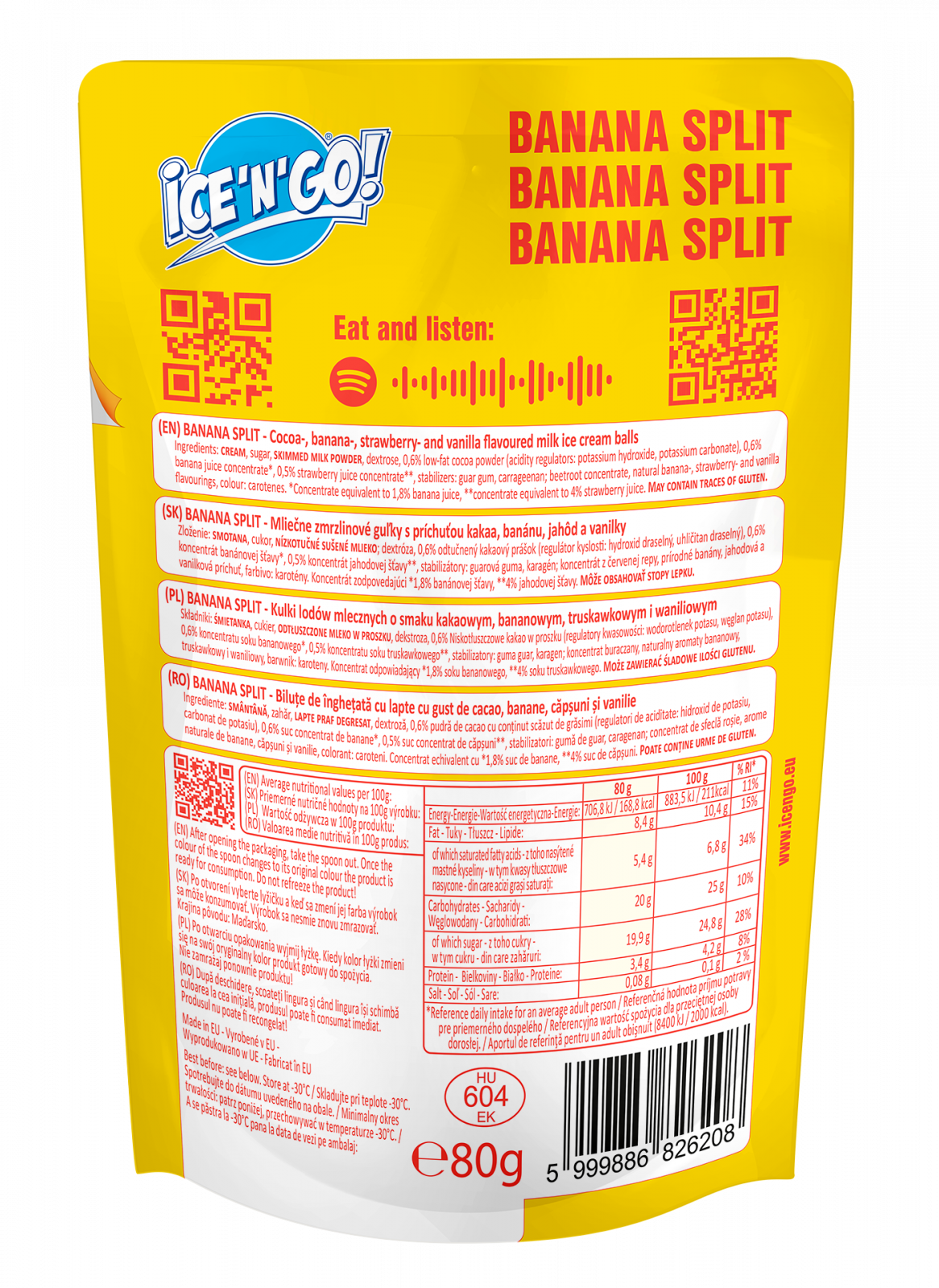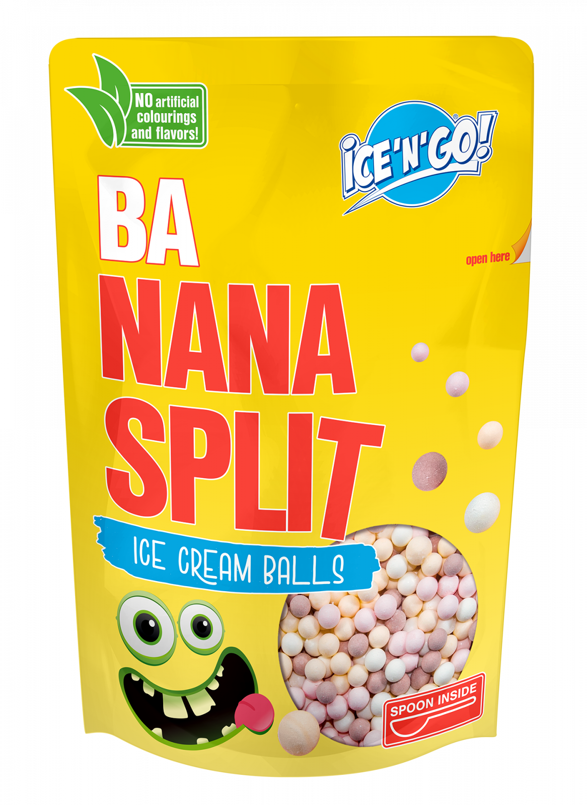 Aroma plăcută de căpșuni proaspete, vanilie moale, banană dulce și cacao îmbunătățește gustul și culoarea unică a bananei split cremoase ICE’N’GO!